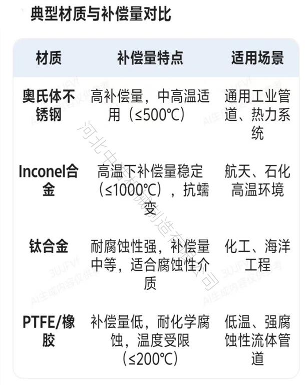 疲勞壽命與循環(huán)補(bǔ)償能力,例如316不銹鋼或鎳基合金 屬于高疲勞強(qiáng)度材質(zhì),可承受多次循環(huán)變形,長(zhǎng)期保持設(shè)計(jì)補(bǔ)償量。而普通碳鋼屬于低疲勞強(qiáng)度材質(zhì),易遭受反復(fù)變形后開(kāi)裂,而補(bǔ)償量逐漸下降。從腐蝕性方面考慮,哈氏合金、鈦合金,屬于耐腐材質(zhì),在腐蝕性環(huán)境中,不易劣化,補(bǔ)償量穩(wěn)定,而普通304材質(zhì)在弱酸環(huán)境中易腐蝕減薄,從而導(dǎo)致補(bǔ)償量異常增大造成泄露。從材料厚度方面考慮,薄壁材料補(bǔ)償量較大,但承壓能力較低,一般是用低壓系統(tǒng),而厚壁材料,補(bǔ)償量較小,但可耐高壓。因而在選擇時(shí)需要綜合補(bǔ)償量與強(qiáng)度關(guān)系。在選擇時(shí)還可參照典型材料與補(bǔ)償量對(duì)照表: