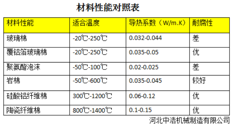 明確溫度范圍,一般分為低溫(-50 ℃-常溫)常見冷庫管道和液化天氣管系等,注意防止結(jié)露。中溫管道(常溫-300 ℃,常見如蒸汽或熱水系統(tǒng),而高溫(300 ℃-1200 ℃),如鍋爐煙氣或高溫反應(yīng)器管道。還需考慮介質(zhì)特性,如是否屬于腐蝕性氣體或酸堿介質(zhì),流體流速是否過大,如壓縮機(jī)出口流速較大。還需注意環(huán)境要求,如化工防爆區(qū)需要阻燃材料,防火等級(jí)要求高,如海洋環(huán)境或潮濕地下室需要防潮、防腐。具體可參照下面材料性能對(duì)照表選擇: