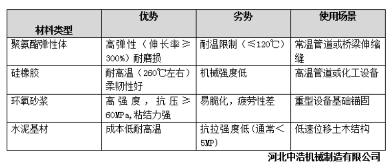 力學(xué)性能主要體現(xiàn)在彈性模量和抗拉抗壓強(qiáng)度以及斷裂韌性,低彈性材料柔韌性好可適應(yīng)較大位移變形,減少應(yīng)力集中,高彈性材料(如混凝土)易因剛性過(guò)渡而開(kāi)裂??估箟簭?qiáng)度高強(qiáng)度材料如(環(huán)氧樹(shù)脂)可承受更大載荷和頻繁位移,使用壽命長(zhǎng)。而低強(qiáng)度材料易在動(dòng)態(tài)載荷下疲勞損壞。針對(duì)斷裂韌性問(wèn)題,可用高韌型材料,可抑制微小裂紋引起的斷裂。從耐久性考慮高溫環(huán)境載300℃以上可選用硅酮膠等耐溫材料,普通材料極易發(fā)生脆化??紤]耐化學(xué)腐蝕化工廠環(huán)境需要抗酸堿材料,例如氟橡膠,避免腐蝕失去密封性。而耐腐性需要選擇對(duì)紫外線敏感材料如(聚氨酯)添加抗老劑,避免使用開(kāi)裂現(xiàn)象??紤]界面強(qiáng)度和搜索率,如低粘性材料(如普通水泥砂漿)極易與金屬基體脫粘,導(dǎo)致滲漏。而高收縮材料(如固化環(huán)氧樹(shù)脂)可能因收縮應(yīng)力引發(fā)斷裂,需要添加膨脹劑。從膨脹系數(shù)考慮,不同材質(zhì)不同。從施工適應(yīng)性考慮流動(dòng)性和固化時(shí)間,狹窄縫隙需高流動(dòng)材料,可用自流平聚合物,確使填充緊密。從固化時(shí)間考慮,如果搶修時(shí)間短可用雙組分聚氨酯,凝聚時(shí)間較短。但需要控制施工進(jìn)度。一般情形可參照材料對(duì)比表: